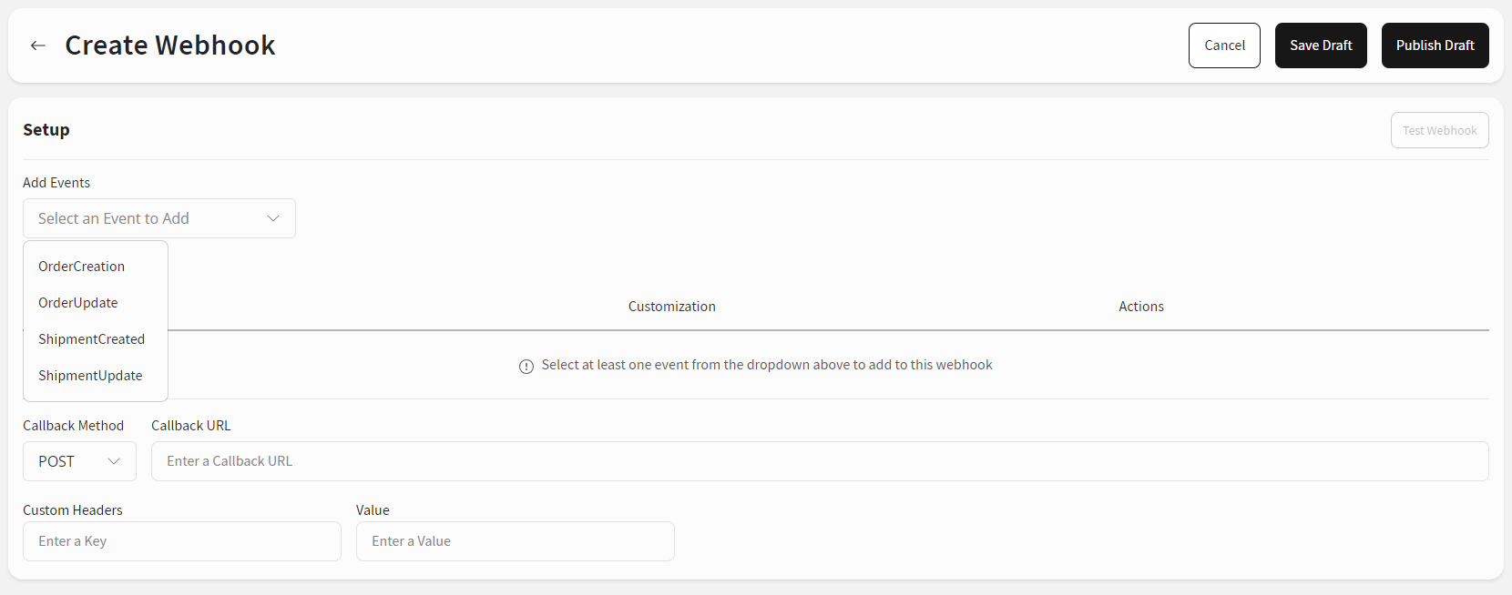 Please note that, you can add multiple events to a single Webhook by adding them from the events drop-down list. From there you can hit Publish or Save Draft to continue later.