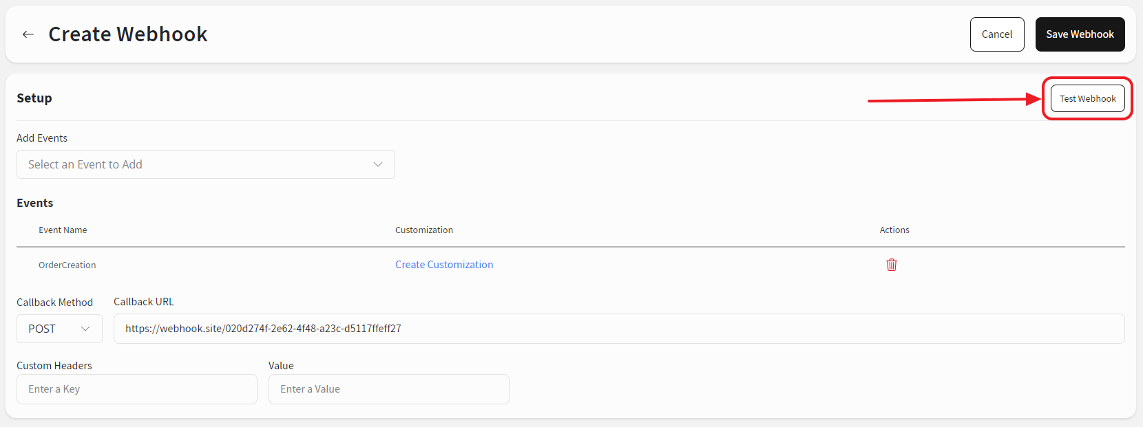 You can test your Webhook subscriptions, by triggering the Test button on the Create Webhook page or by triggering the Test Webhook button before hitting the Publish Draft.